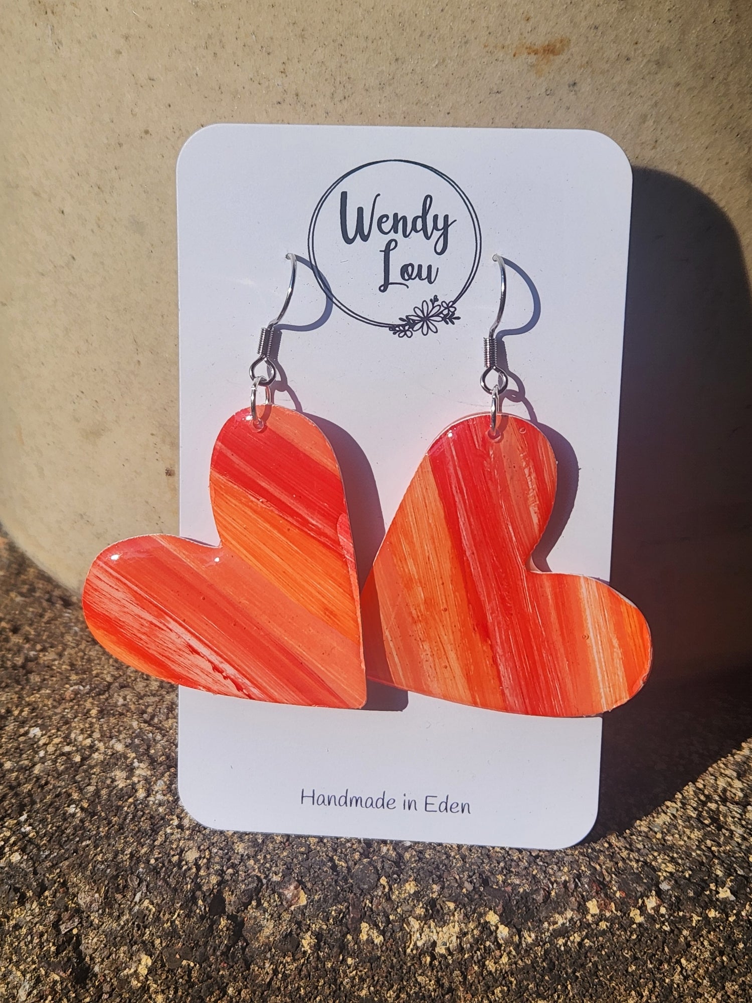 These beautiful orange earrings are made using hand painted synthetic paper and covered with resin which makes them really lightweight to wear. The back is a shade of orange which compliments the front nicely.