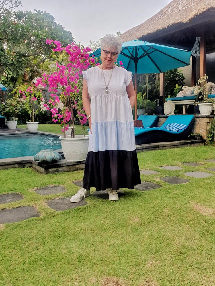 Introducing Nora – the epitome of summer charm! Bask in the sun with our three-toned tiered dress, designed to keep you floating through your day with grace. Nora's unique design, highlighted by ruffles on each sleeve and dual-sided pockets, captures the essence of relaxed elegance. With a meticulously tailored bodice, Nora ensures utmost comfort without compromising on style. As she cascades into a longer dress, each tier adds a playful element to your look. Whenever you're in the mood for something effortlessly stylish and comfy, let Nora be your first choice
