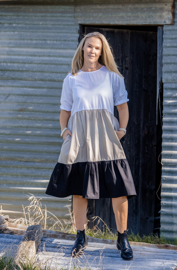 Meet Erna - a plus-size dress that combines elegance, comfort, and timeless style. Crafted from 100% poplin cotton, Erna exudes sophistication with its three-toned tiered design. Whether you're heading for a casual brunch or an evening soirée, this dress ensures you make a statement. The longer sleeves make it a versatile piece for any season, while the pockets add a touch of functionality to the elegance. More than just a dress, Erna is a testament to classic fashion that never goes out of trend.