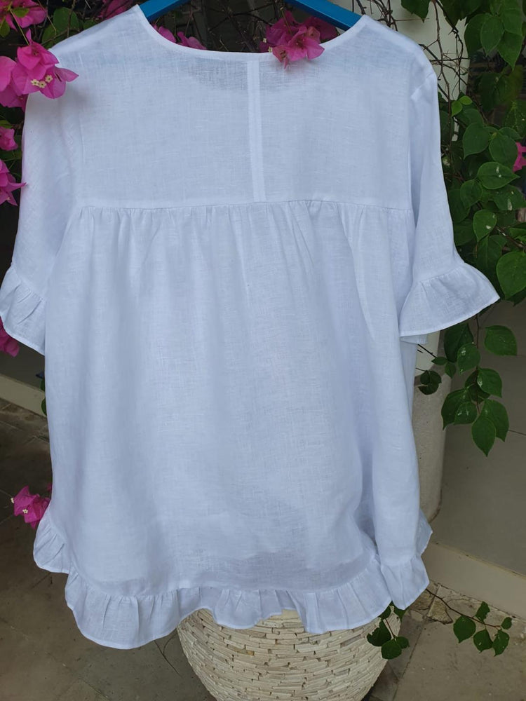 Elevate your summer wardrobe with our Indy Linen Top, where classic meets contemporary. Fashioned from the finest natural linen, Indy boasts the traditional Linen with Luv round neck that seamlessly transitions into longer, playful ruffled sleeves. But the true charm lies in its ruffled bottom hem – offering ample front coverage and extending gracefully at the back. And just when you think the design is complete, the mid-seam ruching on the back makes its grand appearance, adding that special touch of uniqueness. For reference, even while donning a size 3 Indy, there's an abundance of flow and freedom (as seen on our model with a bust measurement of 124 cm).