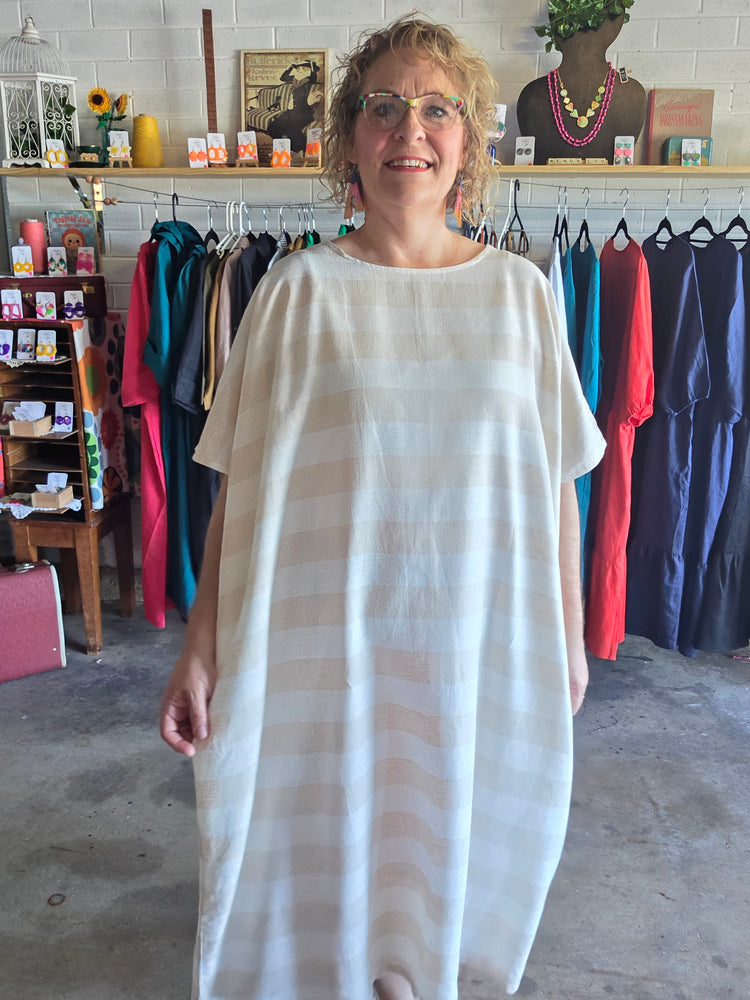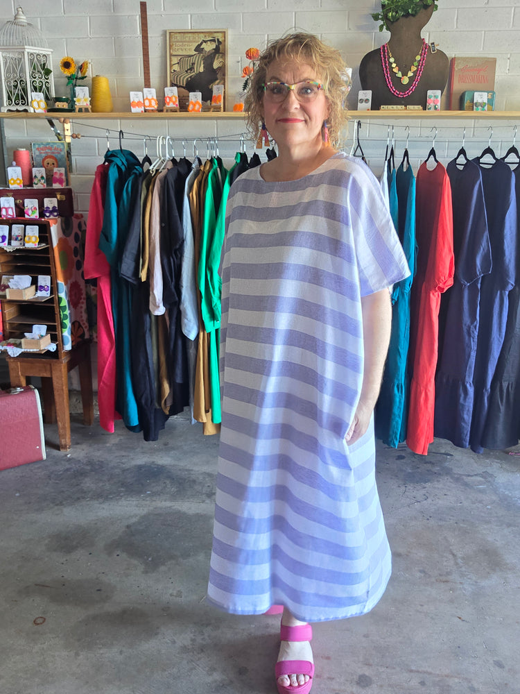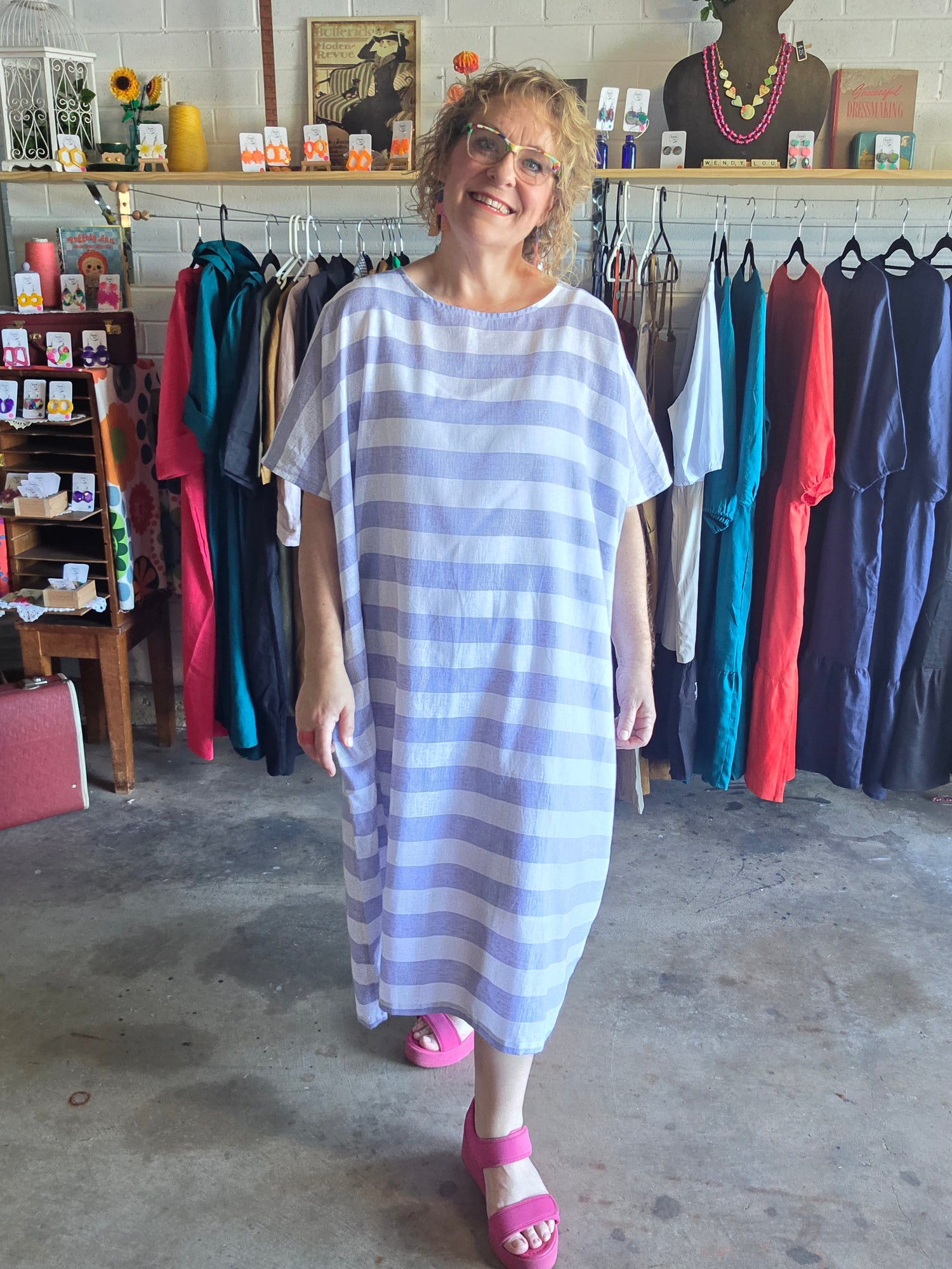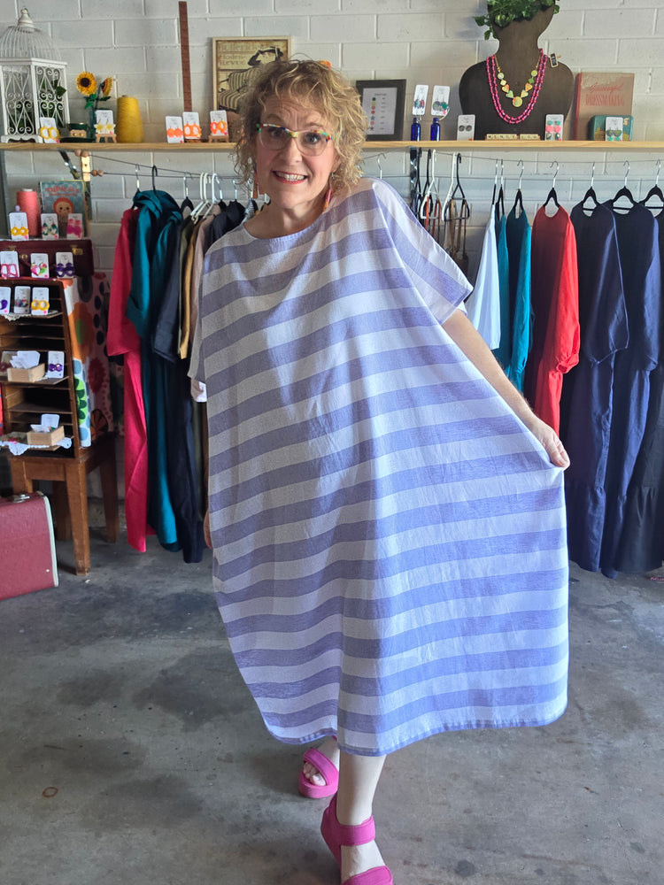 Our Thick Striped Kaftan with its horizontal stripes is perfect to throw over your swimmers to go to the beach or pool, or just laze around comfy on those long summer days.