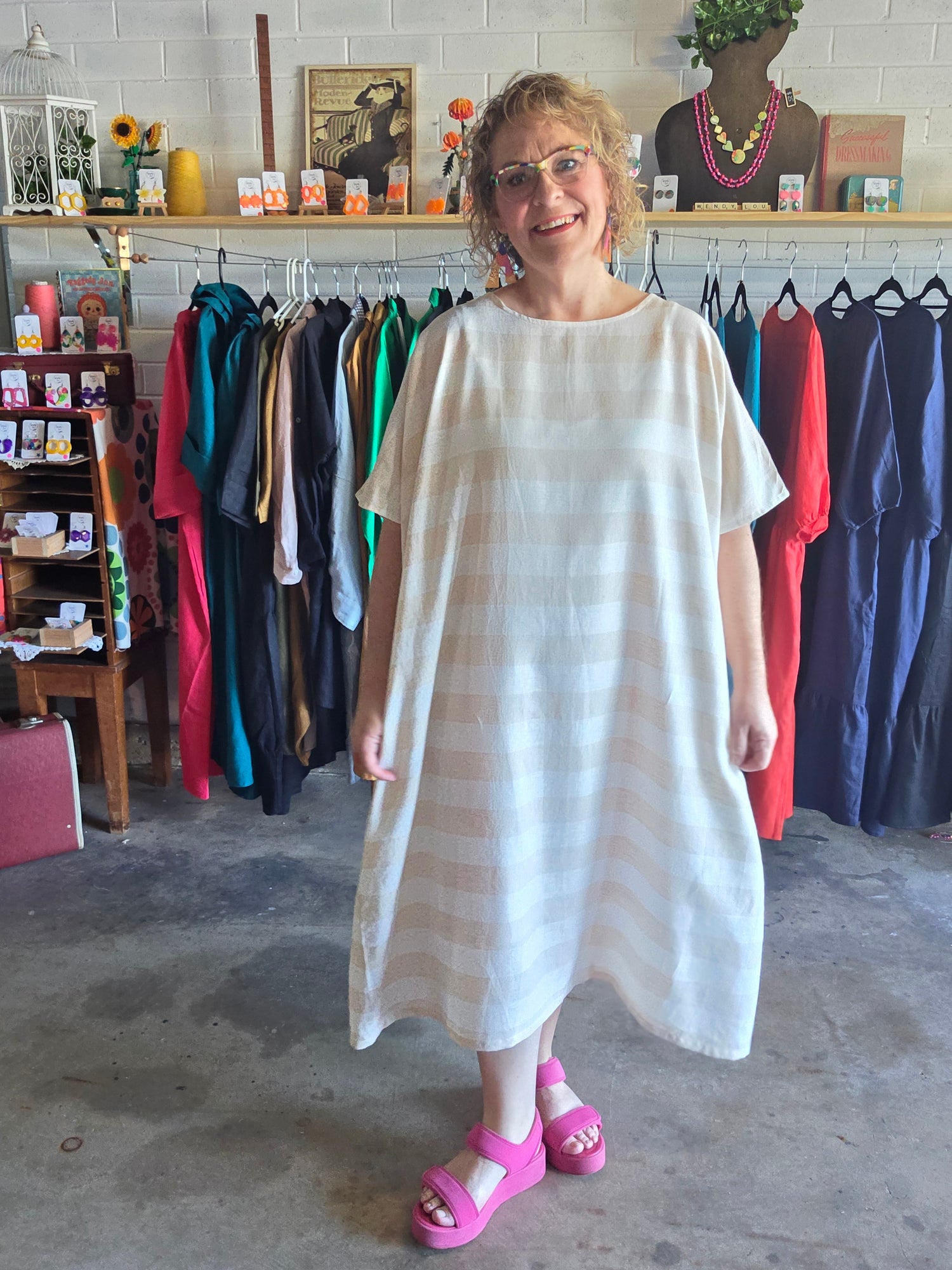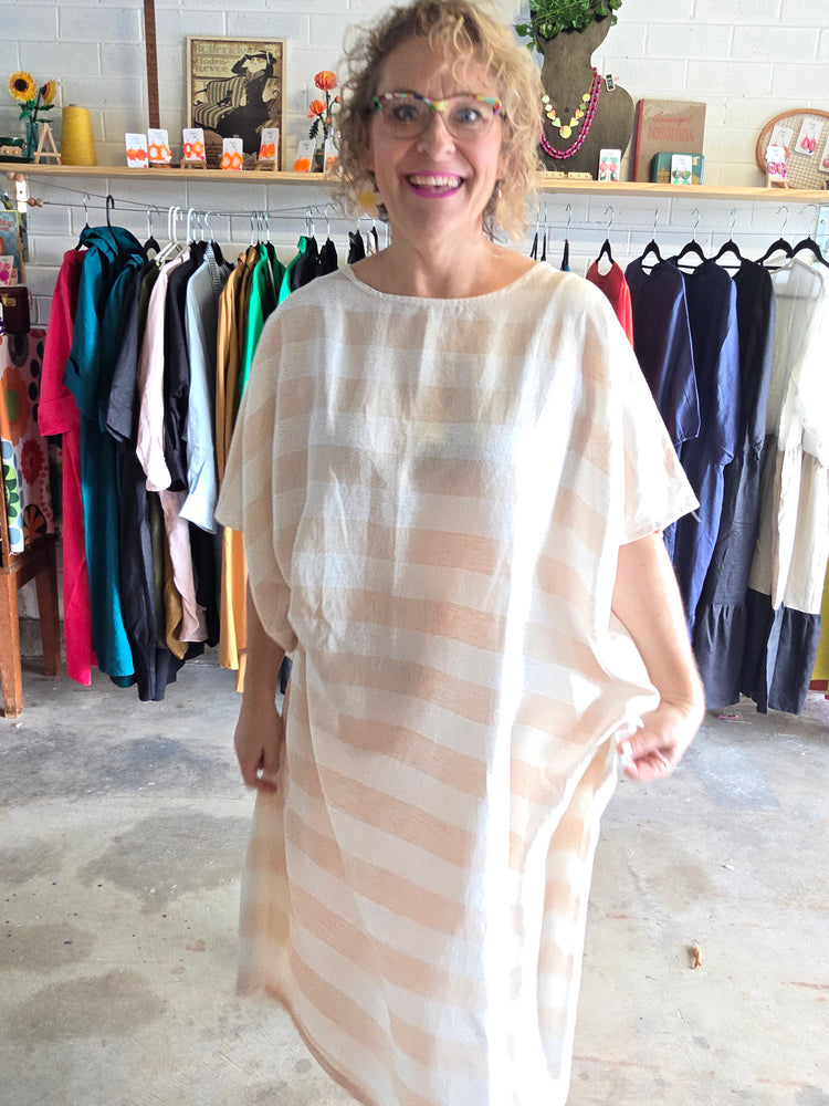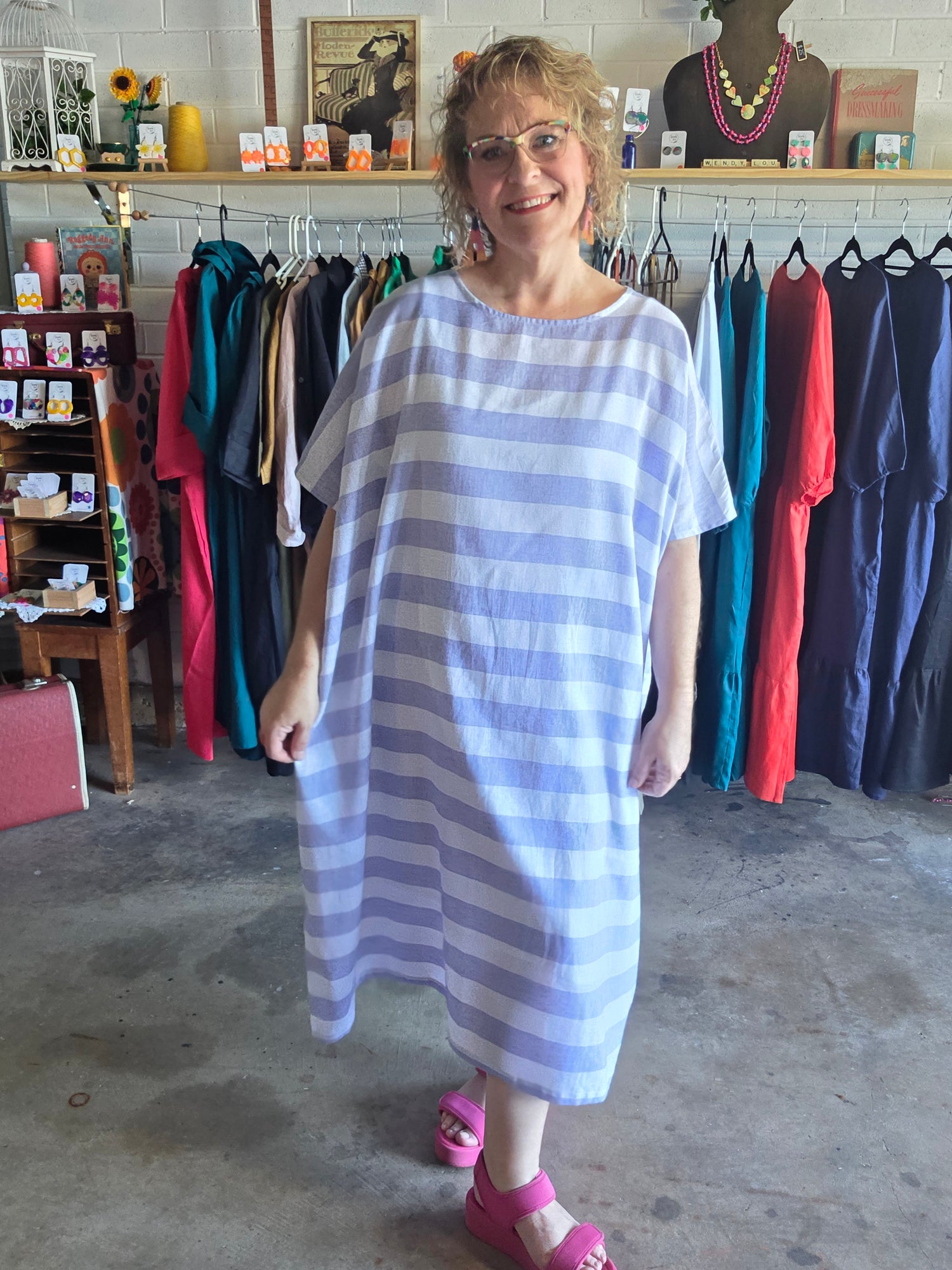 Our Thick Striped Kaftan with its horizontal stripes is perfect to throw over your swimmers to go to the beach or pool, or just laze around comfy on those long summer days.